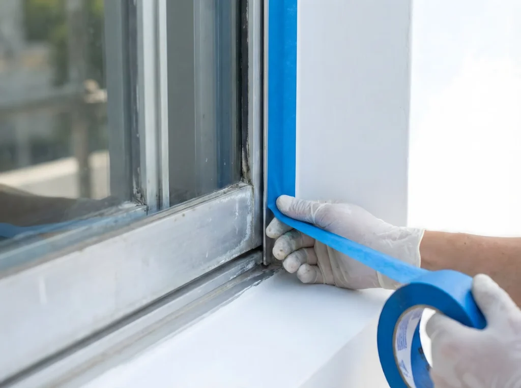 Antes de pintar, cubrí bien los marcos de aluminio, vidrios, cerámicas y pisos con cinta de enmascarar y plástico.