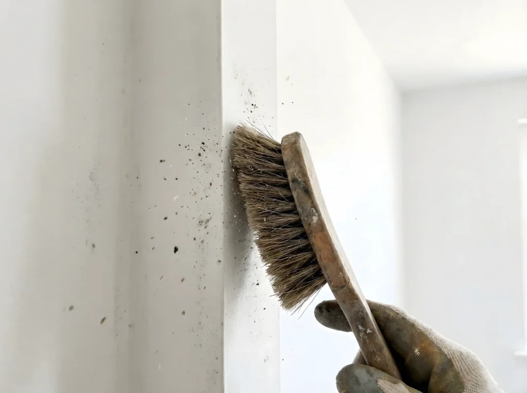 Remové el polvo, hongos sueltos y pintura descascarada utilizando un cepillo o una espátula.